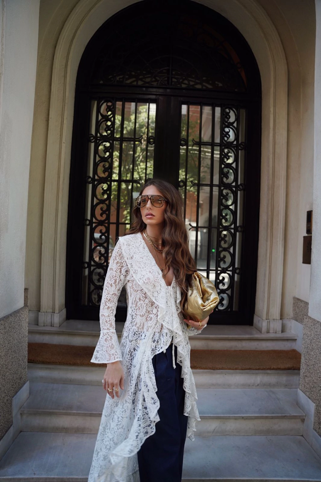 · Blusa em renda, modelagem ampla e shape solto. Possui decote em V e mangas longas. Possui fechamento por amarrações na parte frontal.