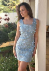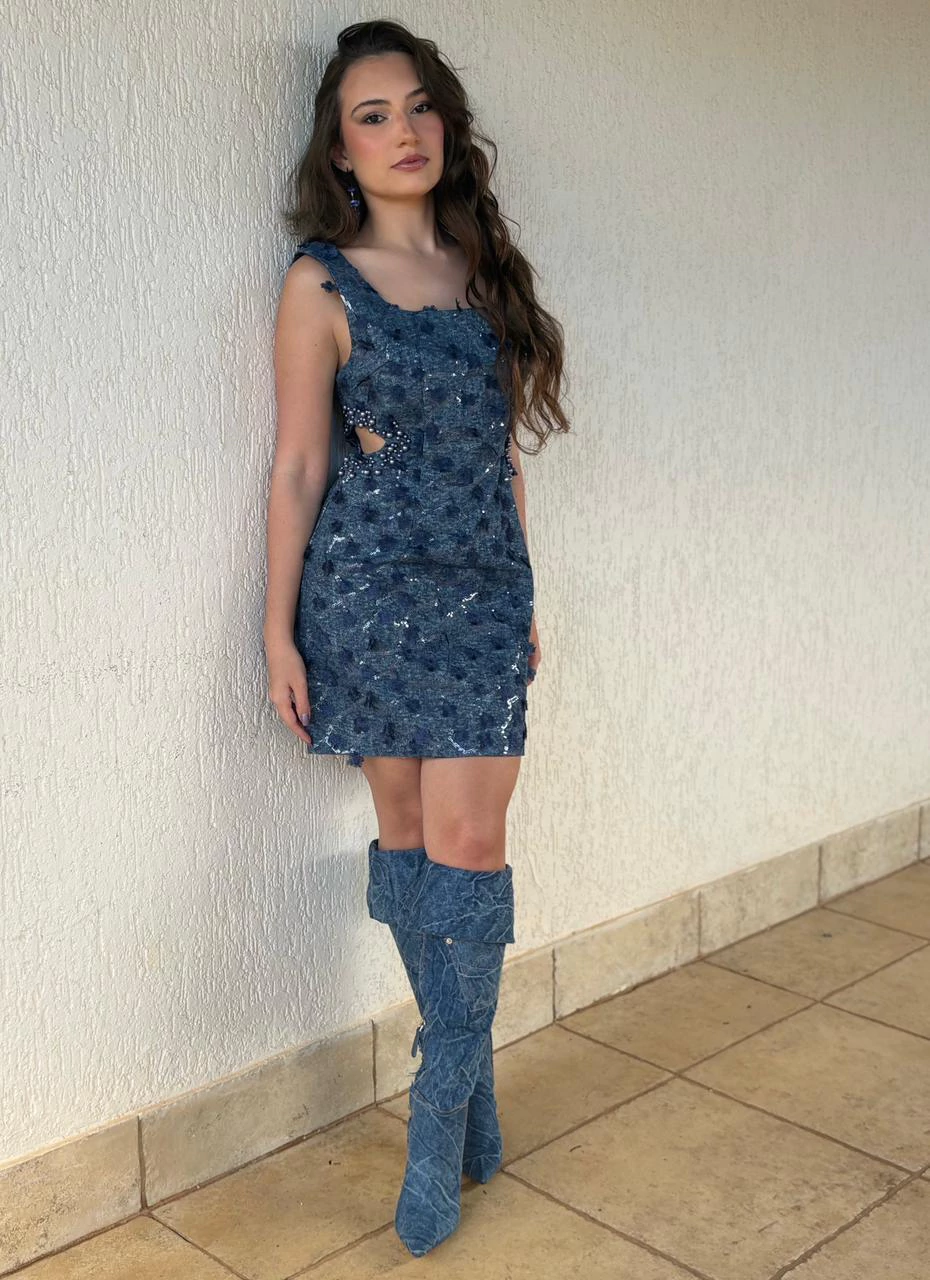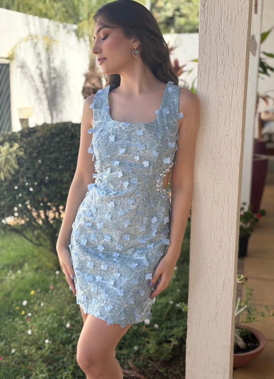 · Vestido Jeans curto. Possui bordado e aplicação de rosas. Recortes na cintura com aplicações em pérolas. Fechamento com zíper invisível na parte de trás da peça.